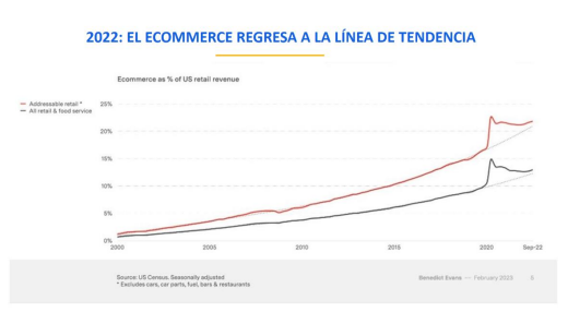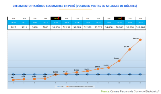 Tras dos años de crecimiento superando el 50%, el comercio electrónico desacelera su crecimiento y regresa a niveles de prepandemia. Según el informe Observatorio Ecommerce 2022-2023 de la Cámara Peruana de Comercio Electrónico (CAPECE), esta industria en el Perú creció 30%, moviendo un total de US$ 12,1 mil millones el año pasado. Proyecciones “Nuestra proyección